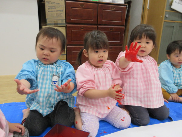 手にたくさん絵の具をつけて~😊ちょっとドキドキ!