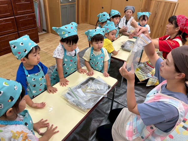 手を洗ってエプロンと三角巾をつけてクッキングスタート🚩