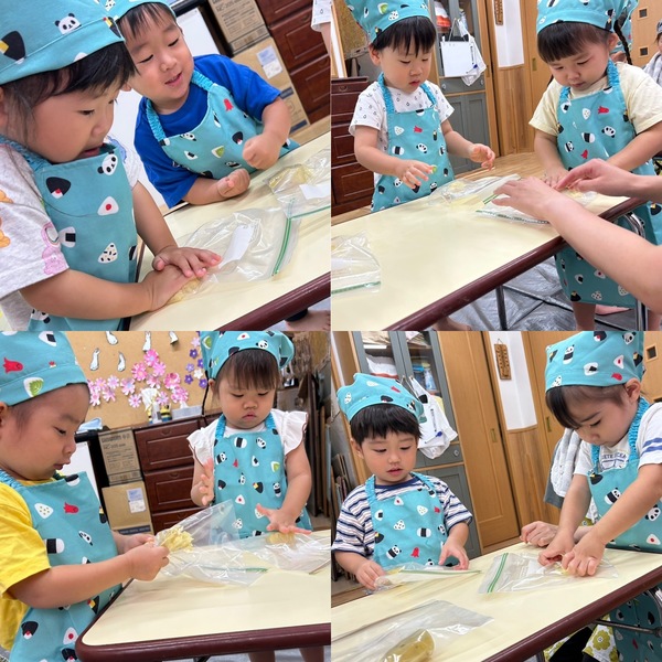 潰したおいもをおだんごの形にしてみようと言われて真剣な顔でやってますね。