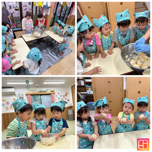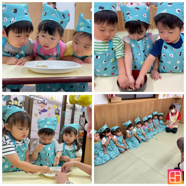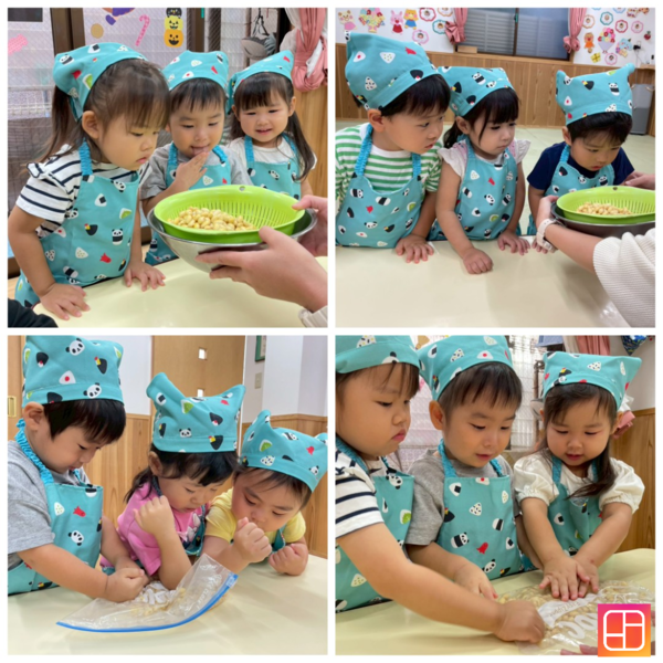 つぶしたおまめに麴やお塩をいれてかきまぜたらおだんごにして寝かせるんだって。