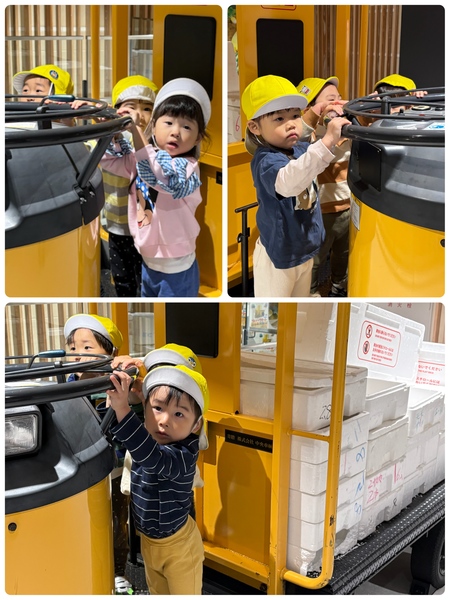 市場の乗り物のターレーに乗って。「しゅっぱ~つしんこう🚩」