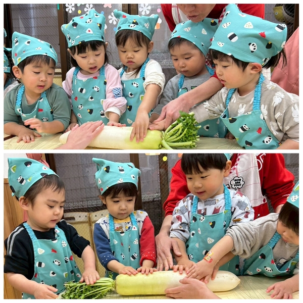 切った大根をもらって「めがねみたい~」ってうれしそうです😊