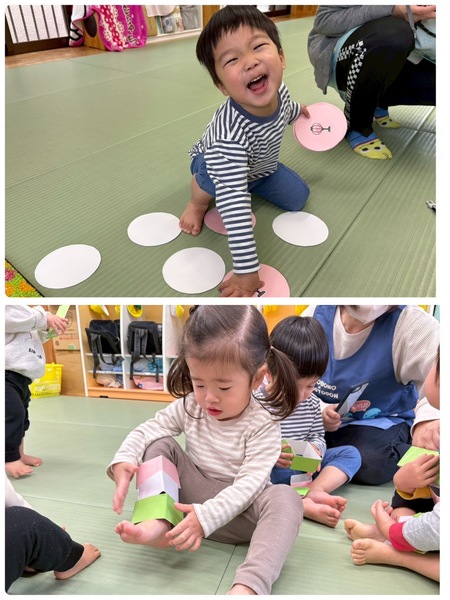 ぞう組さん・うさぎ組さん・ひよこ組さん、みんな集まり、ひなまつりのお話を聞いて、絵合わせ・シール遊び・ひし餅の積み上げをして楽しみました。