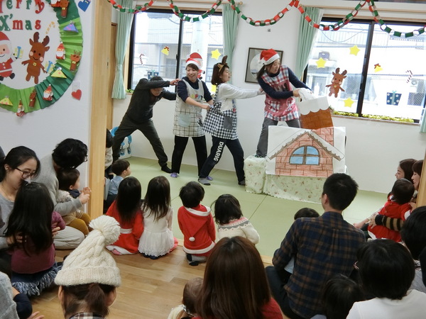 朝の会の次は、先生たちの劇・親子でふれあい体操・プレゼント交換・保護者同士景品目指してジャンケン大会と会場は盛り上がっている最中、、、