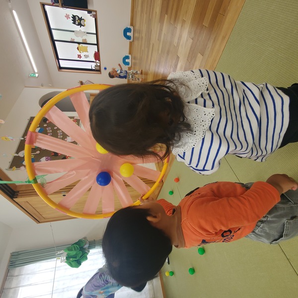 フラフープにテープをつけてボールをくっつけてみたり、取ったりして楽しみました。
