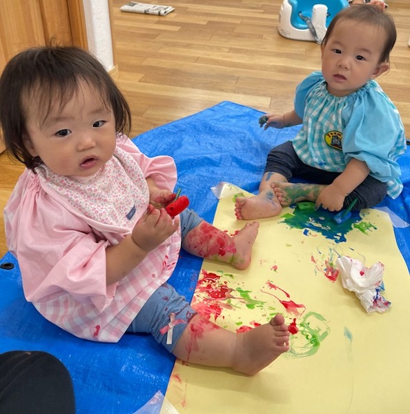 服や足に絵の具が付いてもお構いなく楽しんでいました☆