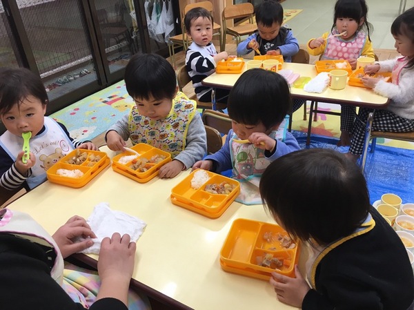 最近うさぎ組の子どもたちは、給食を一人で食べられるようになってきました!