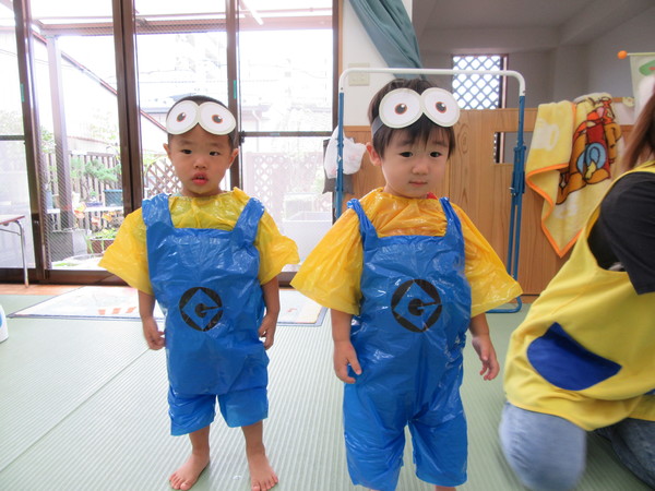 ミニオンズに変身した子どもたちが仲間のミニオンにバナナ拾って食べさせてあげるゲーム形式の競争でした。