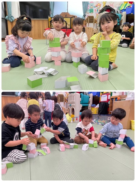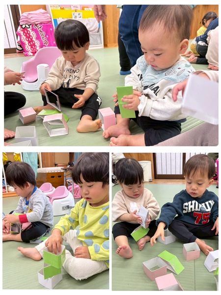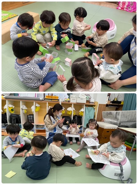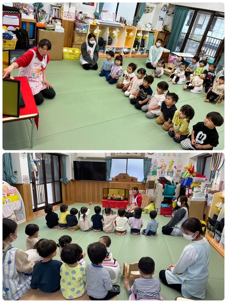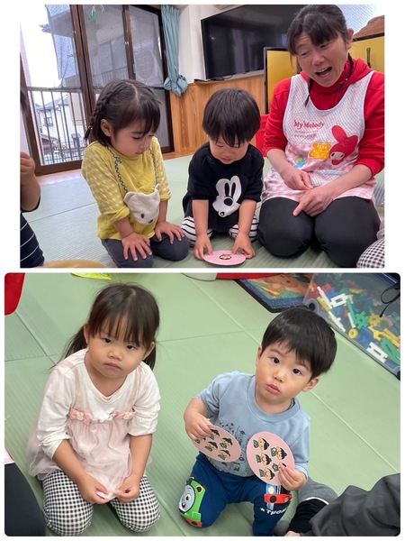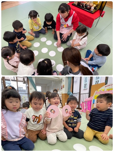 ぞう組さん・うさぎ組さん・ひよこ組さん、みんな集まり、ひなまつりのお話を聞いて、絵合わせ・シール遊び・ひし餅の積み上げをして楽しみました。